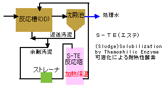 最終沈殿池より引き抜かれた余剰汚泥は,S−TE槽で好熱菌の活性となる高温で処理し,反応槽(オキシデーションディッチ)へ循環返送され,汚泥の脱水等で反応系外に出すことなく消滅化させることができる。 余剰汚泥はある種の好熱菌が体外に酵素を分泌し,この酵素が余剰汚泥中の細胞を可溶化し,微生物が食べやすい形,いわゆる生物分解可能な有機物に変化され,反応槽へ戻される。好熱菌処理された余剰汚泥は,反応槽で微生物により炭酸ガス・水に分解され消滅化,減容される。1度好熱菌処理された汚泥の生物分解率は,約30/100である。よって,余剰汚泥をすべて消滅化させるためには,100/30倍(約3.4倍)の好熱菌処理を施せばよいことになる。すなわち,発生余剰汚泥の3.4倍量を引き抜いて好熱菌処理し,反応槽へ循環返送することにより,余剰汚泥の完全消滅が可能となる。 平成10年6月より,余剰汚泥の発生ゼロを目指し実験が進められている。(平成10年8月現在) 特徴・留意事項 汚泥の場外搬出・最終処分等が不要である。(余剰汚泥が発生しないから) 環境に優しい。自然界に生息する微生物を利用し,二次災害の心配がいらない。 汚泥処分費が不要になるが,好熱菌処理装置等の電力費がかかる。しかし,処分費より廉価である。 汚泥引抜き搬出を行わないため,リンの捕捉ができない。 生物難分解物質(リグニンなど)は,CODとして処理水中に流出。(CODが高くなる) 臭い対策をとらなければならない。 ※共同研究(日本下水道事業団,中之条町,神鋼パンテック) リンク 神鋼パンテック(S−TEとは?) 神鋼パンテック(株)は,株式会社 神鋼環境ソリューションに2003年10月1日統合。 実験終了・施設は撤去されました。 (注意)中之条に行ってんべえは,個人で運営されています。公的なものではありません。 produced by Kogure Hiroshi |