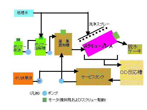 システム概要 オキシデーションディッチ(OD反応槽)より直接活性汚泥を引き抜いて,脱水する。 すなわち一般的に必要な汚泥の濃縮槽が必要ない。 嫌気状態をつくらず直接脱水が出来る。 すなわち,臭気が出ないので,脱臭機が不要になる。 ヴァルート脱水機は24時間全自動無人運転が可能なので,管理人件費が低減できる。 脱水機がコンパクトで,上屋が小さくてすむ。 脱水ケーキの含水率を85%以下にできるため,汚泥処分費の低減ができる。 耐久テストを実施中であるが,消耗部は連動リングのみで,消耗した部分だけを短時間の作業で交換できる。 (注意点) 凝集剤にポリ硫酸第二鉄とポリマーが必要である。前者を使用するので,設備周りをステンレス化しなければ錆に対応できない。 ※共同研究(日本下水道事業団,中之条町,アムコン(株) ) (注意)中之条に行ってんべえは,個人で運営されています。公的なものではありません。 produced by Kogure Hiroshi |
