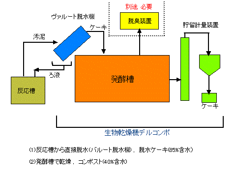 汚泥の減量化・再利用化をして汚泥処理費を軽減することを目指している。緑地還元可能な乾燥ケーキを生成する一体型コンパクトな生物乾燥機は中山間地のニーズである。余剰汚泥をヴァルート脱水機で脱水ケーキ化(含水率約80〜85%)し,発酵槽へ連続投入すると約1/4に減量する。乾燥ケーキは,含水率が約40%以下で,一次発酵が進み有機物の分解により減量/減容する。
