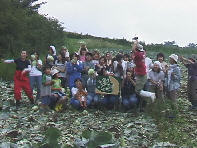 伊参スタジオを12時ちょっと前に出発。畑に到着。大きくなっている。師匠に挨拶。 橋詰師匠にキャベツの収穫の仕方(包丁で切る)を教わる。いよいよ,収穫開始。 また,宇宙キャベツの宅配のためラベルを書く。 サクサクと切る感じがたまらない。採ったキャベツは,箱づめ。手渡しで,キャベツを集める。 採ったキャベツがあっと言う間に山積みになる。師匠の切り方と箱づめの技を見る。 Mもお手伝い?み〜ちゃんの看板のあるキャベツも大きくなった。 箱づめしたら,振込用紙とふたの紙をすいて,大きいホチキスで止める。 箱が完成したら,宛名シールとお届け時間指定のシールを貼る。 採ったキャベツや,自分の名前のキャベツと記念撮影。 キャベツを抱き締めてみる。また,そのまま,食べてみる。甘い味がする。 例によって,上毛新聞の取材を受ける。 宇宙畑看板の前にキャベツをおいて記念撮影。 おにぎり何個食べた?人気者の福蔵さん。 新婚さん,キャベツみたいに甘い・・・。 収穫終了につき,記念撮影。 記念撮影。・・・。 記念撮影。集合写真。猫の手にハッピーバースディコーラスプレゼント。宙に浮いている(左手) バーベキュー準備。 マスターも鉄板の手入れ。みんなで,準備。 さて,焼き始める。 キャベツが,甘く焼けた。黒岩師匠が,トウモロコシや野菜を差し入れてくれた。 乾杯を待つ特製宇宙ビール。 ラベルのデザインもいいし,味もいい。 きく,乾杯。 橋詰夫妻も宇宙宴に来てくれた。ビンゴでまさやん関連グッズほか特別奉仕。 マスター&しまけんによるギターの弾き語り。 やっぱり,花火をした。 しまけんのギター&ハーモニカで盛り上がる。